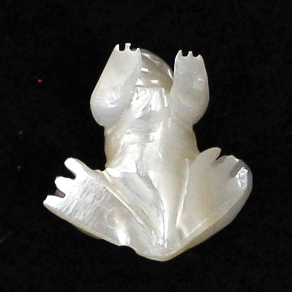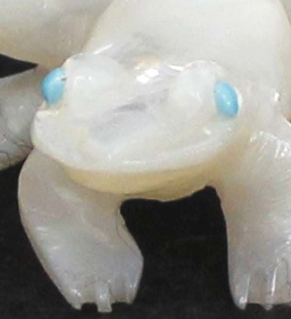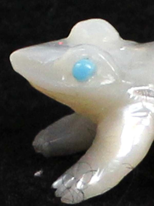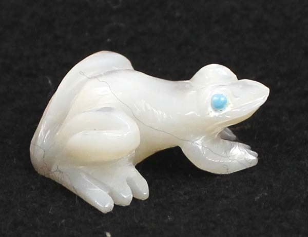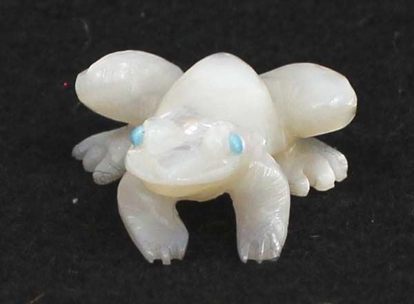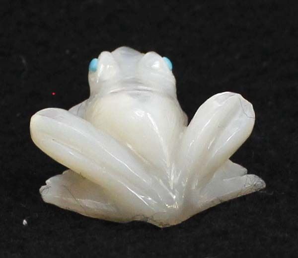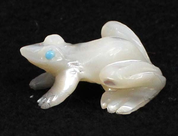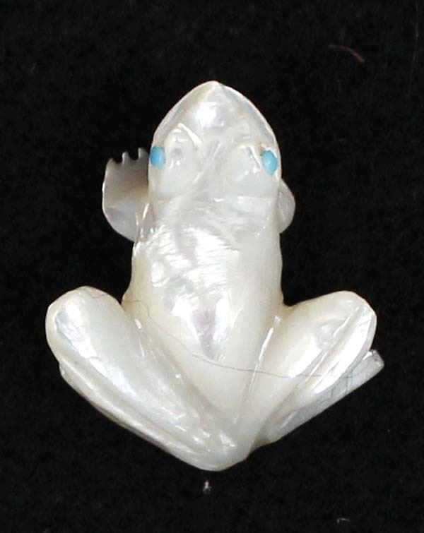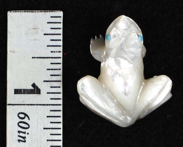 Native American Zuni Mother of Pearl Frog Fetish by Dan Quam, measures 1'' x 1'' x .75'', turquoise eyes, artist's initials on the bottom