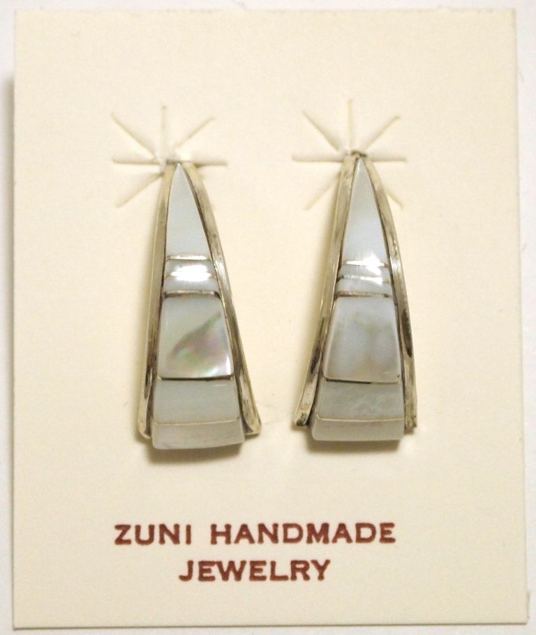 Zuni Mother of Pearl Inlay Sterling Silver Curved Post Earrings - C.S. Lonjose
