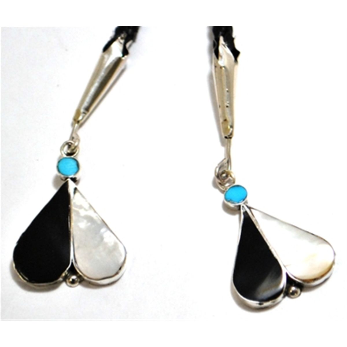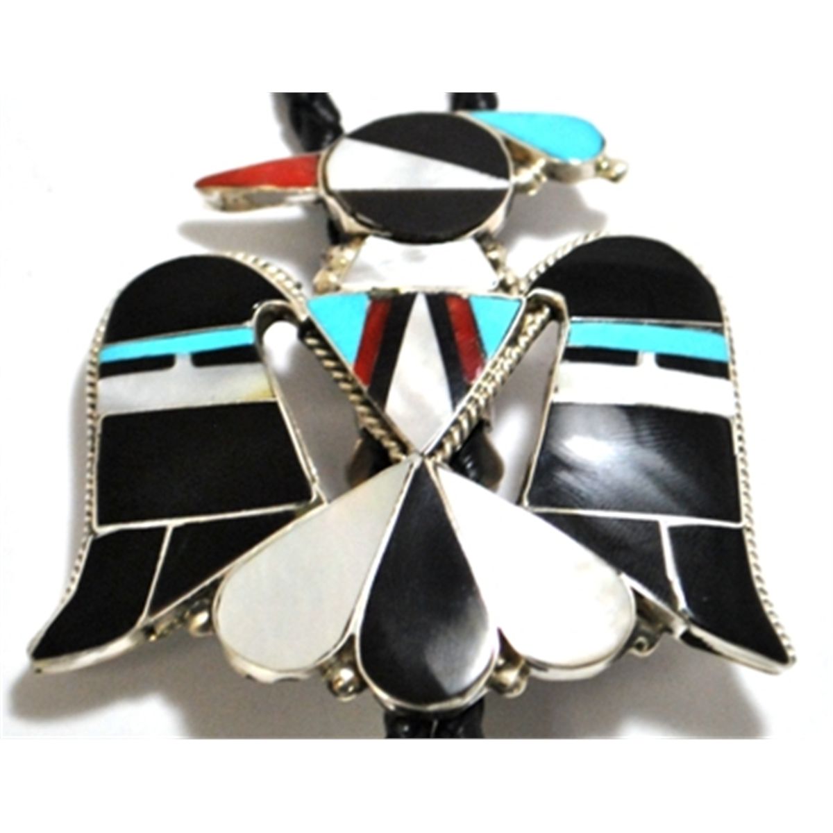 Measures 2-3/4" tall by 3" wide, 36" around. Tips measure 1-1/4" tall by 1" wide. Stones present: Mother of Pearl; Black Jet; Coral; Turquoise.