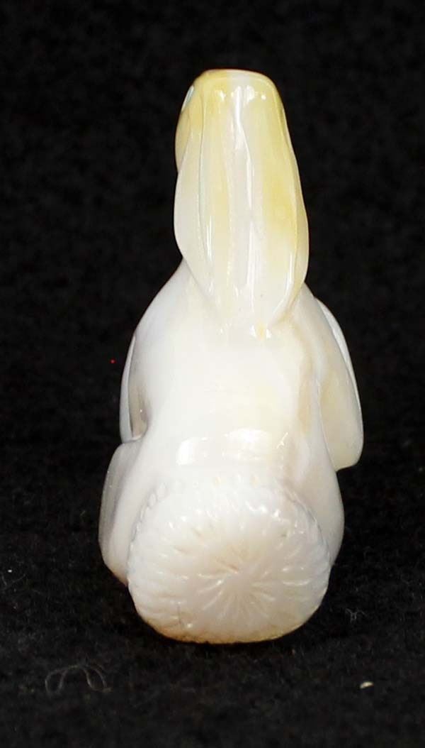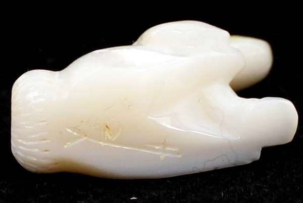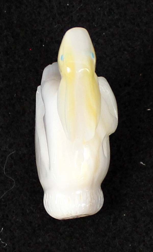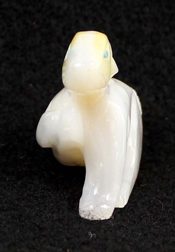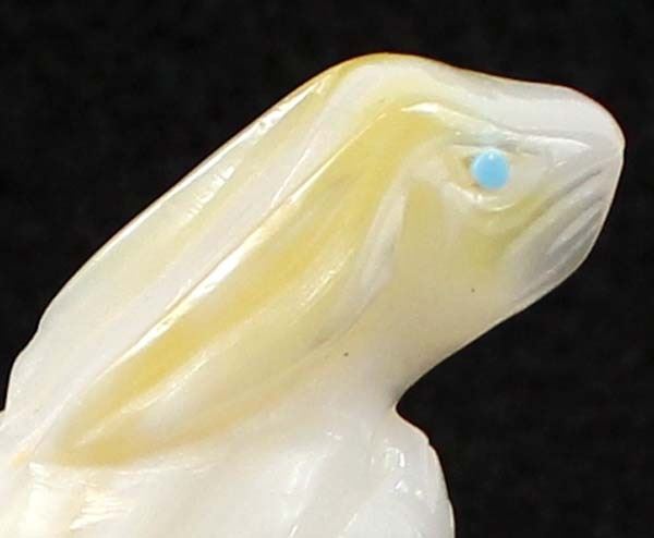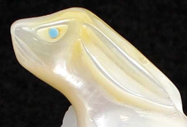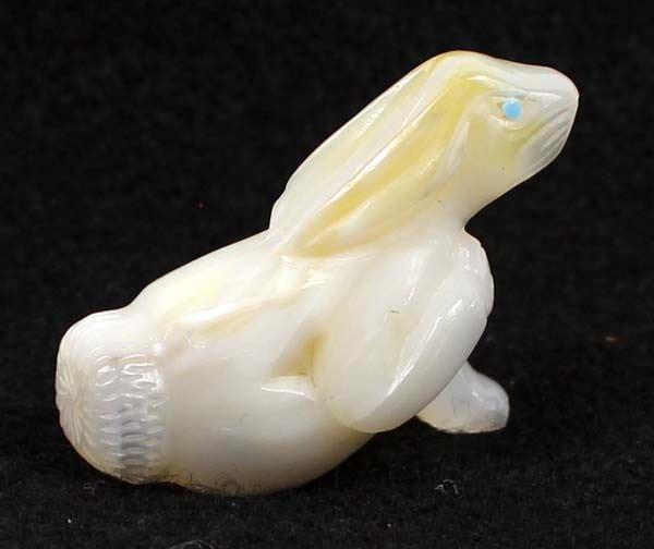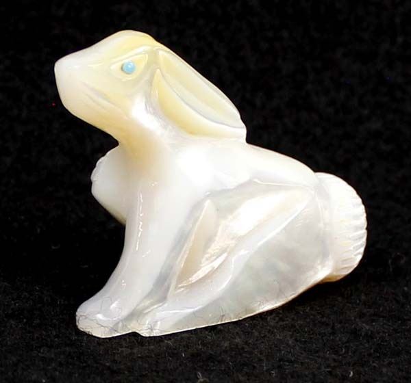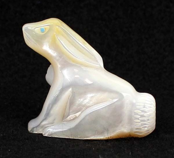 Native American Zuni Mother of Pearl Rabbit Fetish by Yancy Robert Halusewa (deceased artist), measures 2'' x 1.25'' and is signed on the bottom, turquoise eyes