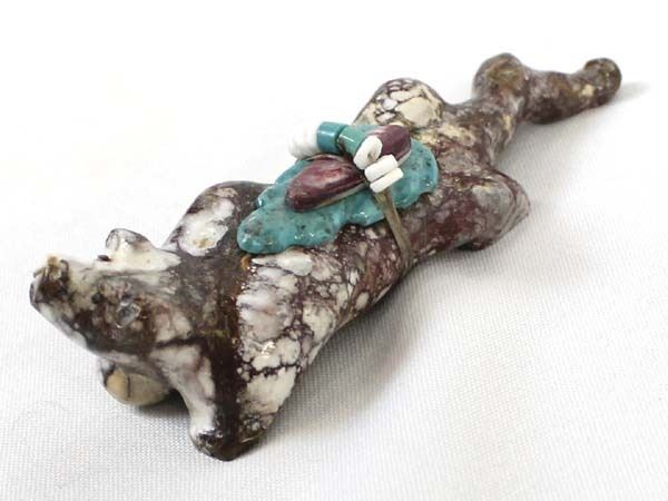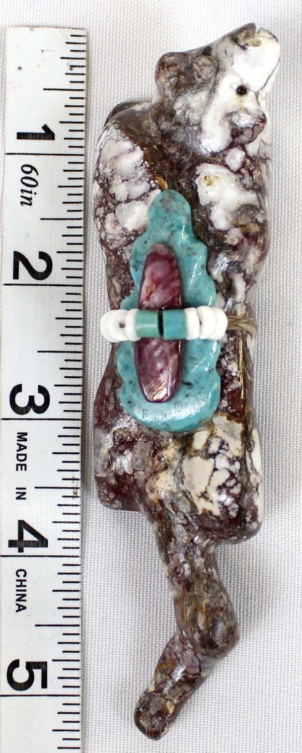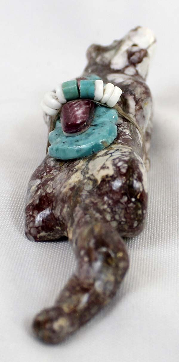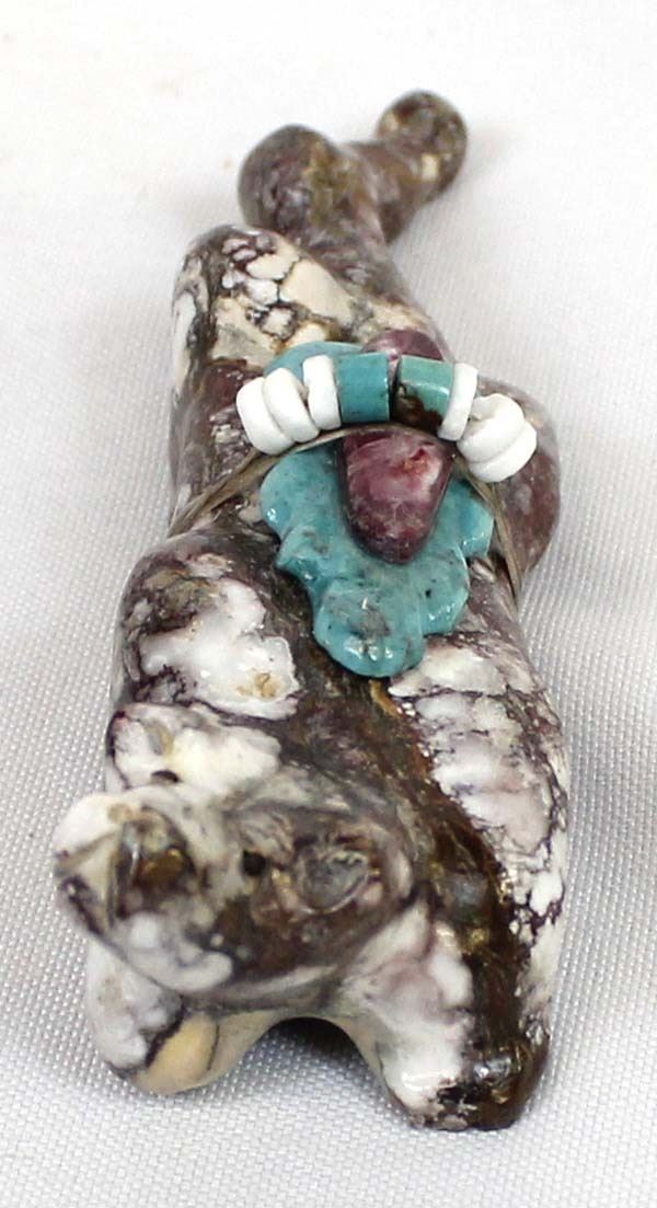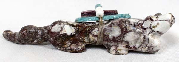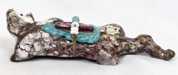 Native American Zuni Wild Horse Stone Mountain Lion Fetish by Hayes Leekya, measures 5''L x 1.25'' x 1'' and has artist's initials on the bottom, jet eyes, spirit bundle consists of carved turquoise arrowhead, shell and turquoise heishi, and purple shell, fabulous carving