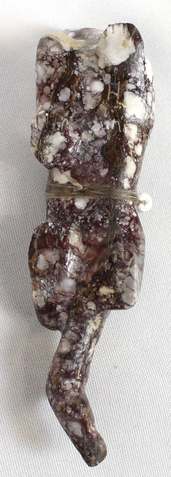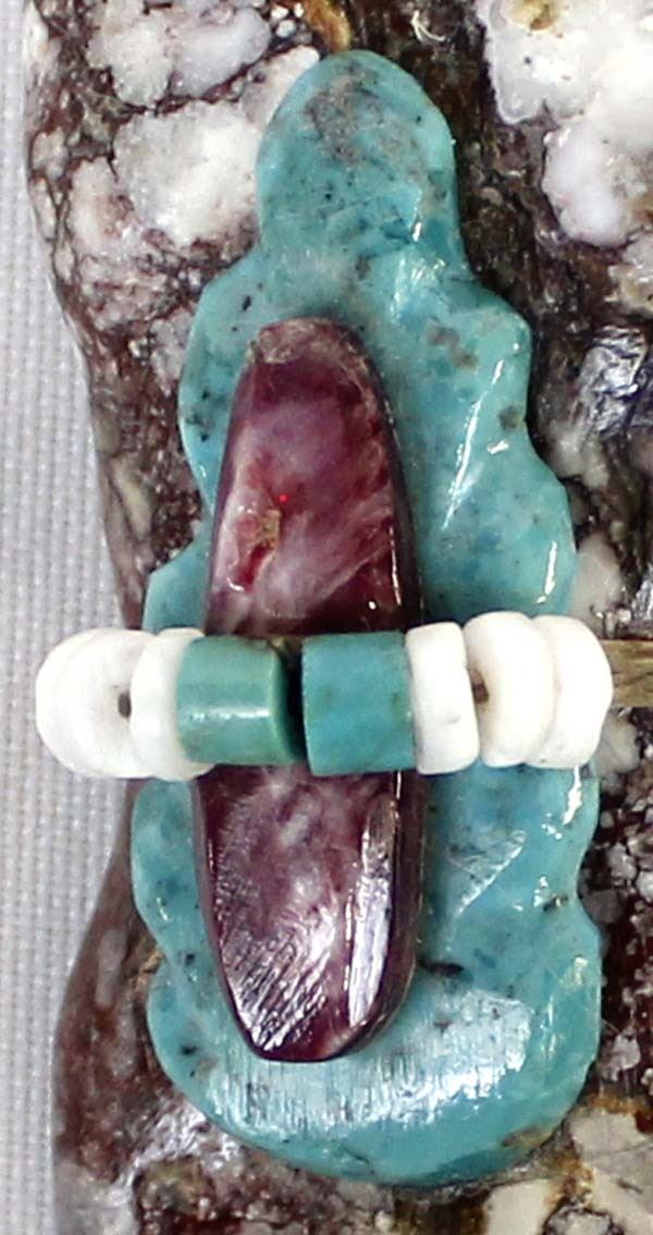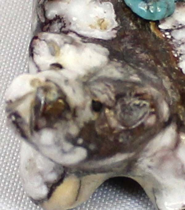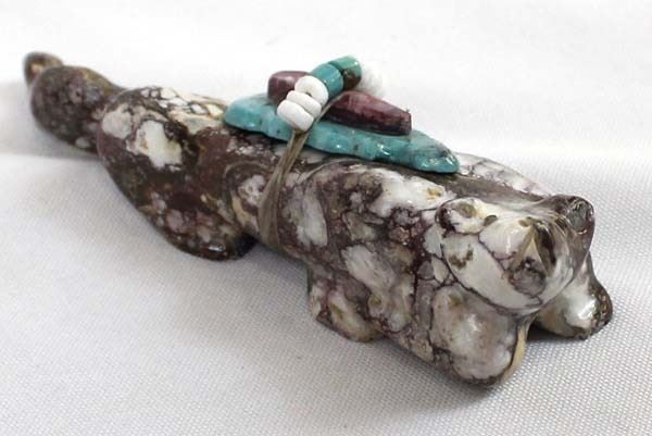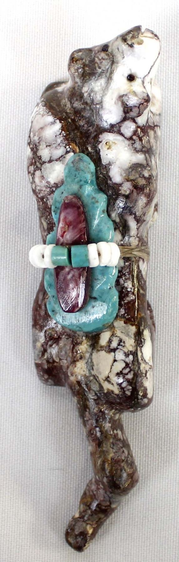 Native American Zuni Wild Horse Stone Mountain Lion Fetish by Hayes Leekya, measures 5''L x 1.25'' x 1'' and has artist's initials on the bottom, jet eyes, spirit bundle consists of carved turquoise arrowhead, shell and turquoise heishi, and purple shell, fabulous carving