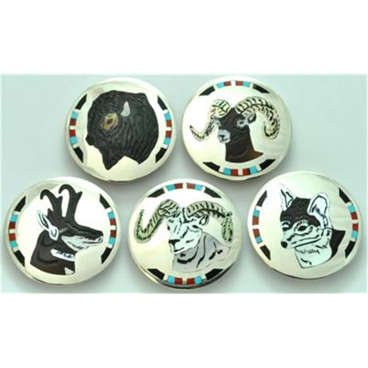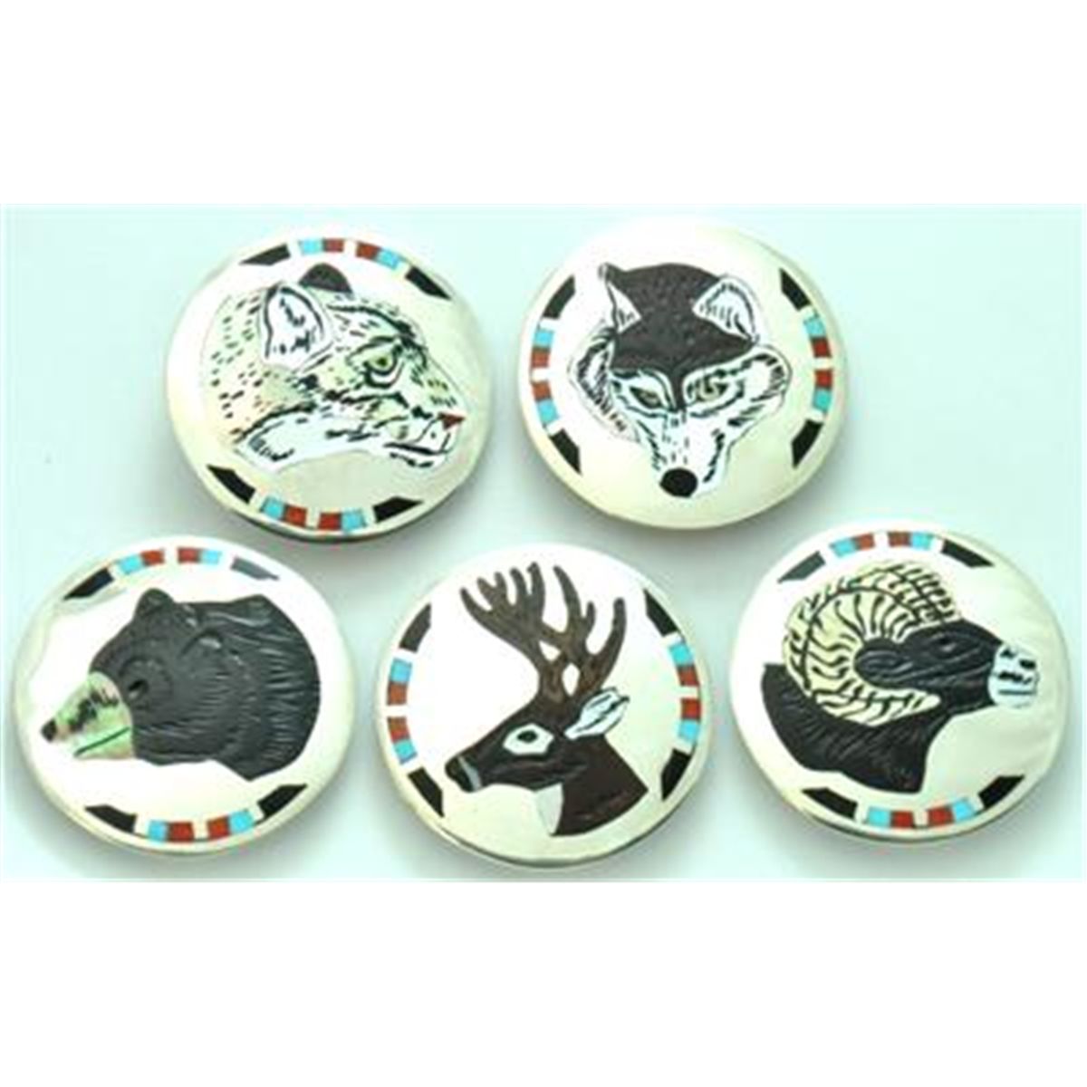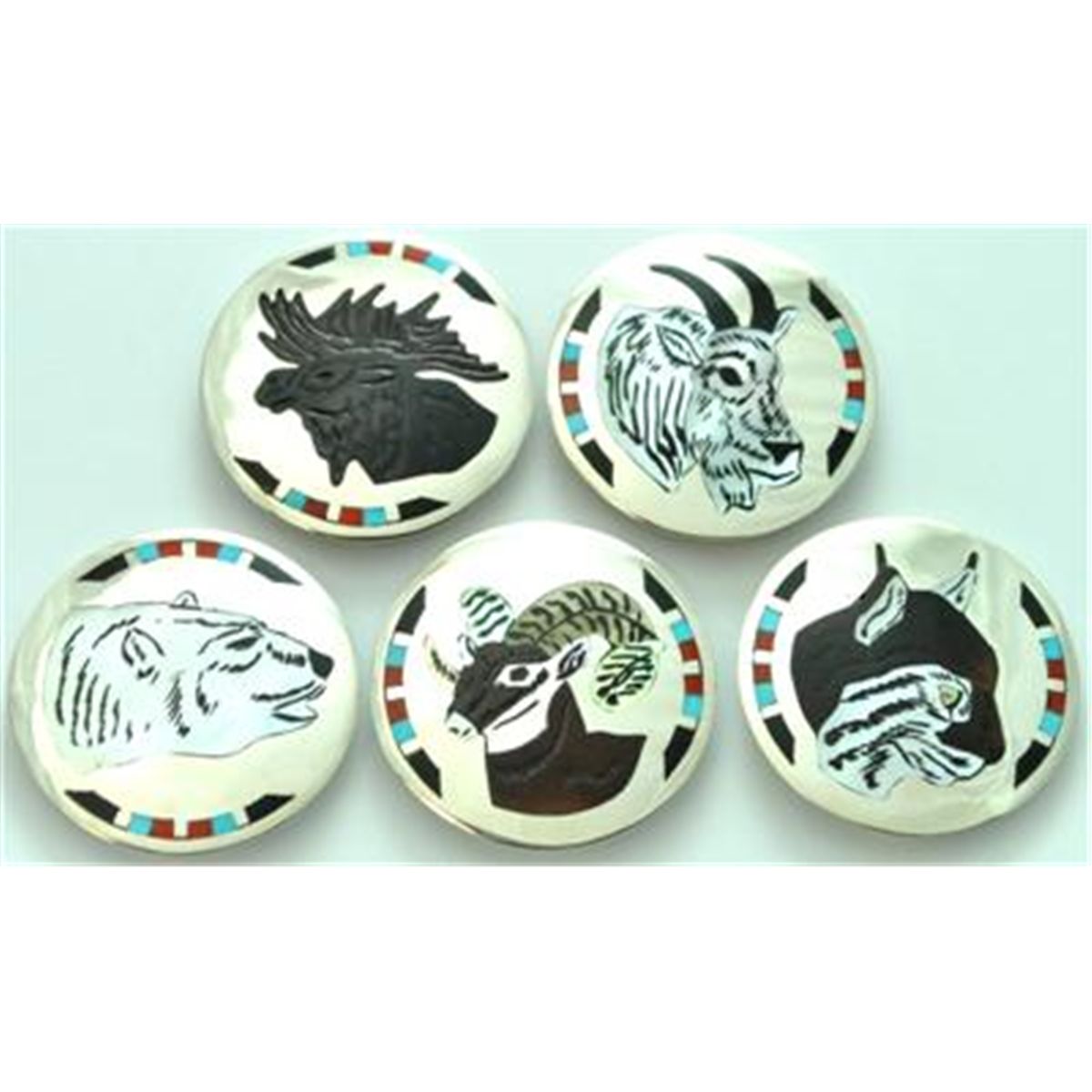 Belt measures 52" long by 1-1/16" wide. Each of 15 badges measure 1-1/2" tall by 1-1/2" wide. Animals included: Cheetah, Wolf, Black Bear, Buck (2), Ram (4), Bison, Fox, Moose, Mountain Goat, Polar Bear, Bobcat. Badges can be adjusted by sliding, and can even be removed and reordered.