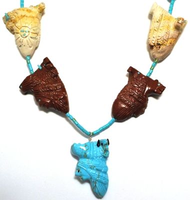Measures 35" around. Bottom fetish measures 2" tall by 1-1/4" wide. Other fetishes measure 1-7/8" tall by 1-3/8" wide. Fetishes made of (bottom to top): Turquoise, Pipestone, Picasso Marble, Turquoise, Black Jet, Mother of Pearl.