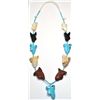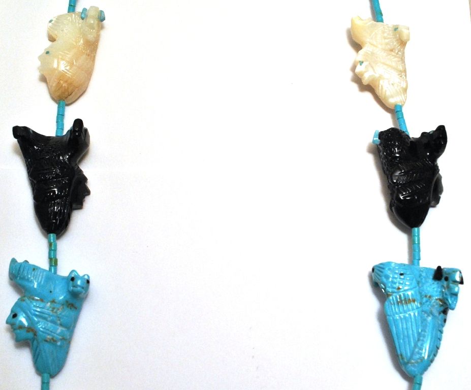 Measures 35" around. Bottom fetish measures 2" tall by 1-1/4" wide. Other fetishes measure 1-7/8" tall by 1-3/8" wide. Fetishes made of (bottom to top): Turquoise, Pipestone, Picasso Marble, Turquoise, Black Jet, Mother of Pearl.