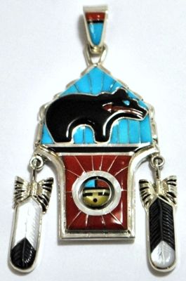 Zuni Multi-Stone Bear & Sun Face Spinner Sterling Silver Pendant - Don Dewa