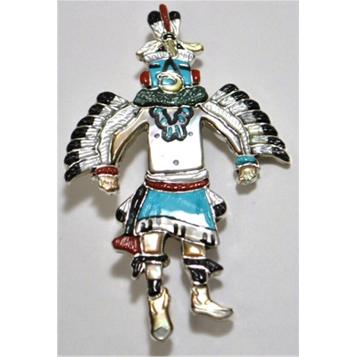 Measures 3-1/2" tall by 2-1/4" wide. Pin on back measures 1-3/4". Stones present: White & Golden Lipped Mother of Pearl, Black Jet, Coral, Turquoise, Malachite.
