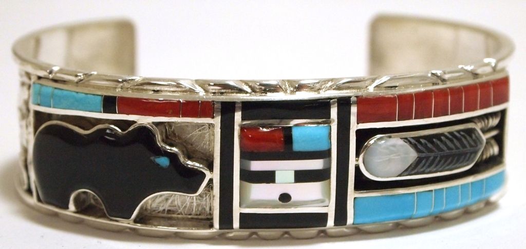 Zuni Multi-Stone Inlay Bear Sunface & Feather Sterling Silver Cuff Bracelet - Don Dewa