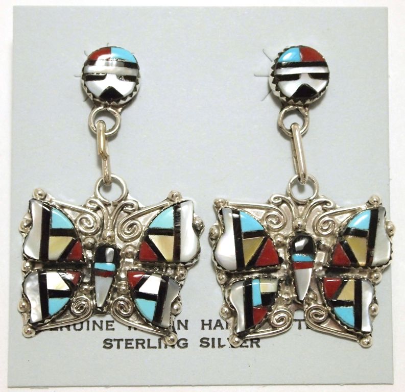 Zuni Multi-Stone Inlay Butterfly Sterling Silver Post Earrings - Herbert Cellicion