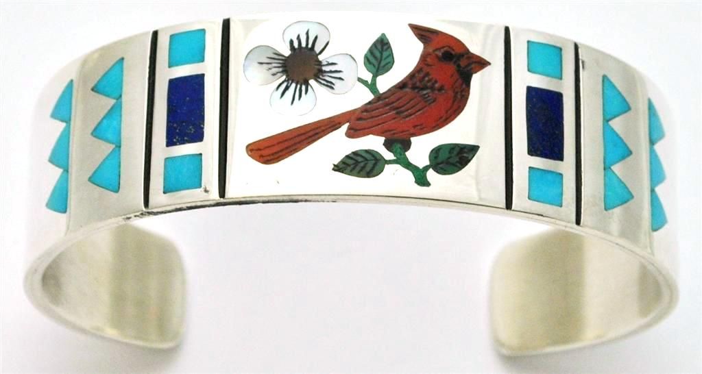 Zuni Multi-Stone Inlay Cardinal Sterling Silver Cuff Bracelet - Rudell & Nancy Laconsello