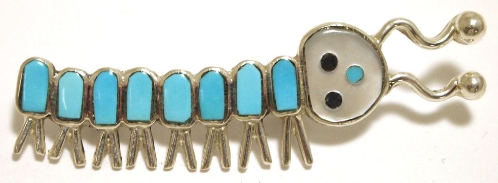 Zuni Multi-Stone Inlay Caterpillar Sterling Silver Pin - Emma Edaakie
