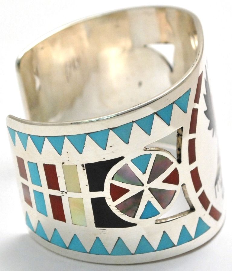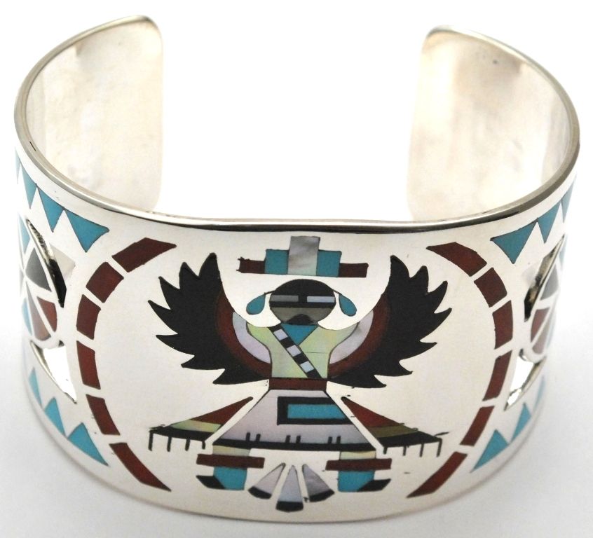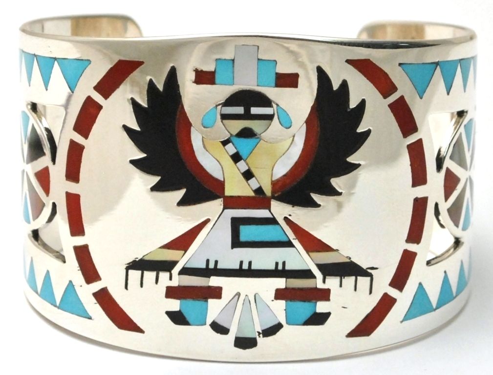 Zuni Multi-Stone Inlay Knifewing Kachina Sterling Silver Cuff Bracelet - Dennis & Nancy Edaakie