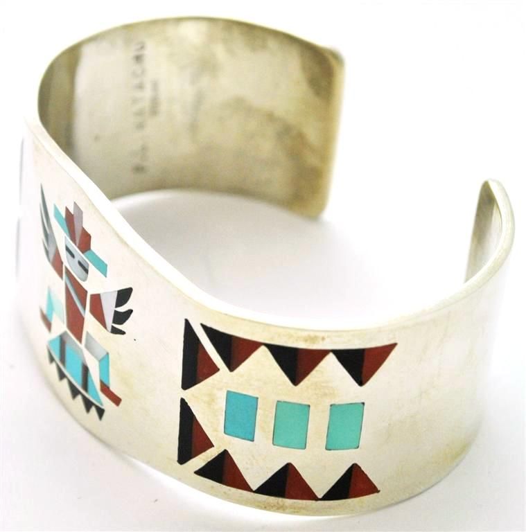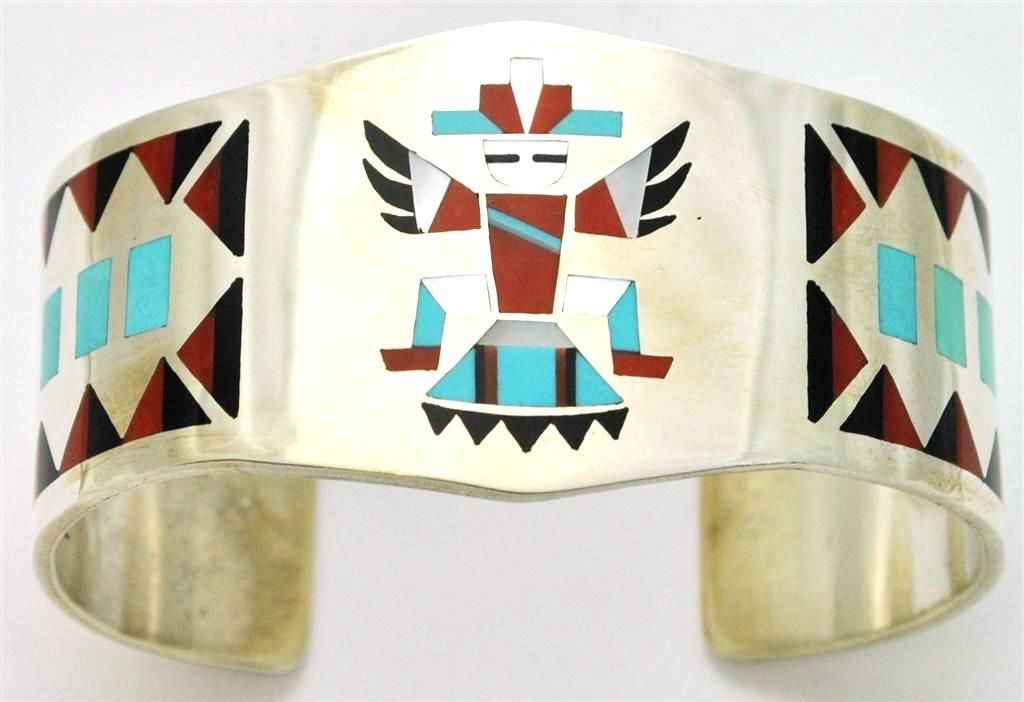 Zuni Multi-Stone Inlay Knifewing Kachina Sterling Silver Cuff Bracelet - Fred & Lolita Natachu