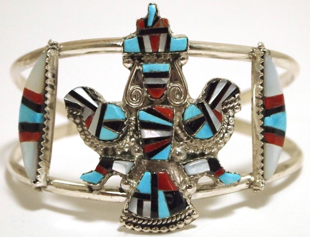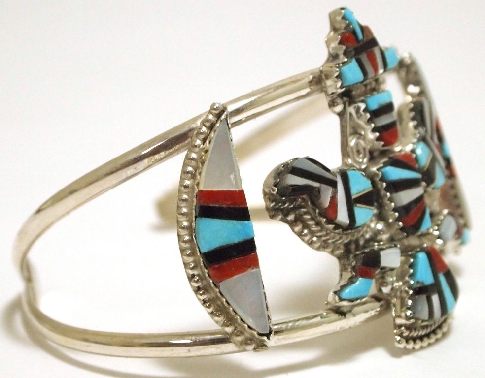 Zuni Multi-Stone Inlay Knifewing Kachina Sterling Silver Cuff Bracelet - Herbert Cellicion