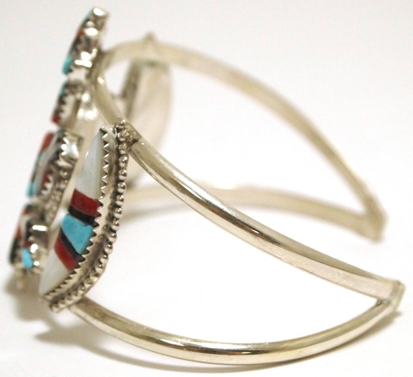 Measures 5-1/4" around with a 1" gap, 1-5/8" wide. Stones present: Mother of Pearl, Coral, Onyx, Turquoise.