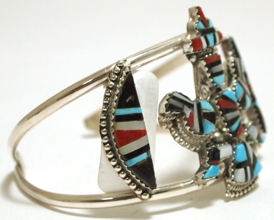 Zuni Multi-Stone Inlay Knifewing Kachina Sterling Silver Cuff Bracelet - Herbert Cellicion