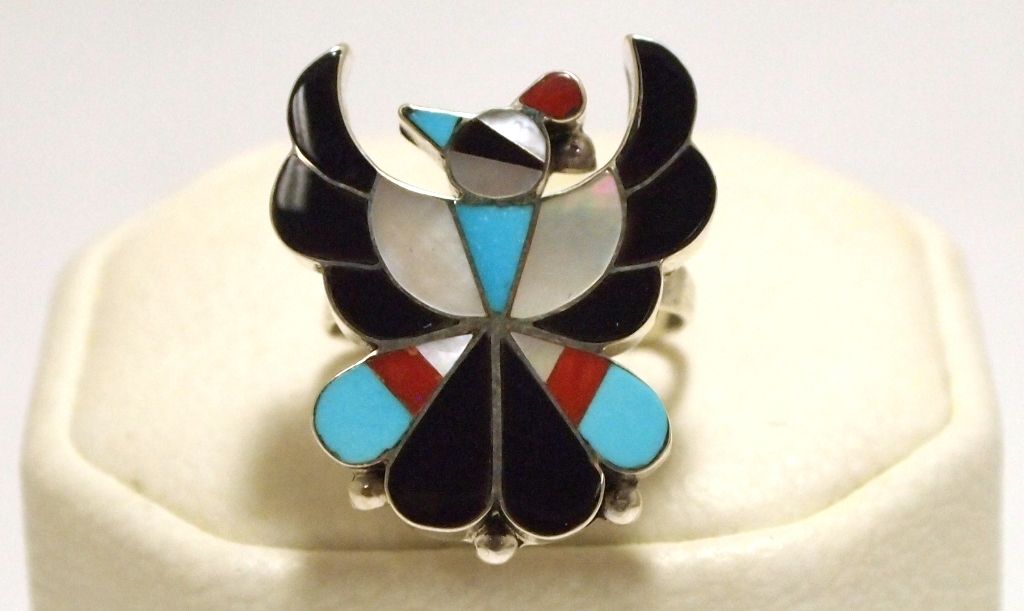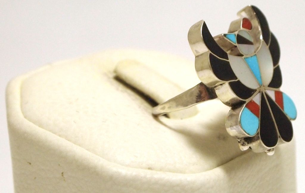 Zuni Multi-Stone Inlay Knifewing Kachina Sterling Silver Women's Ring - Breon Wallace