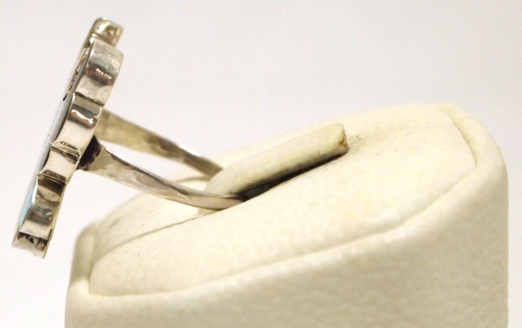 Face measures 1" tall by 7/8" wide. Band measures 1/16" wide, size: 6.75. Stones present: Mother of Pearl, Coral, Turquoise, Onyx.