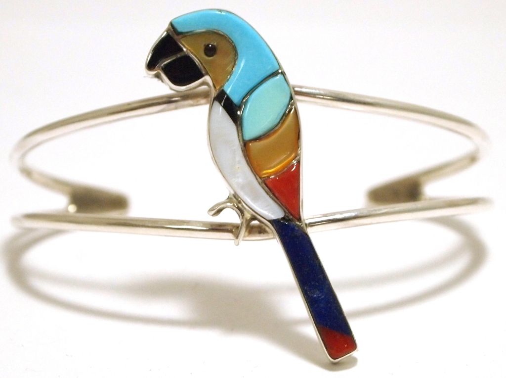Zuni Multi-Stone Inlay Macaw Sterling Silver Cuff Bracelet - Ernie Ohmsatte