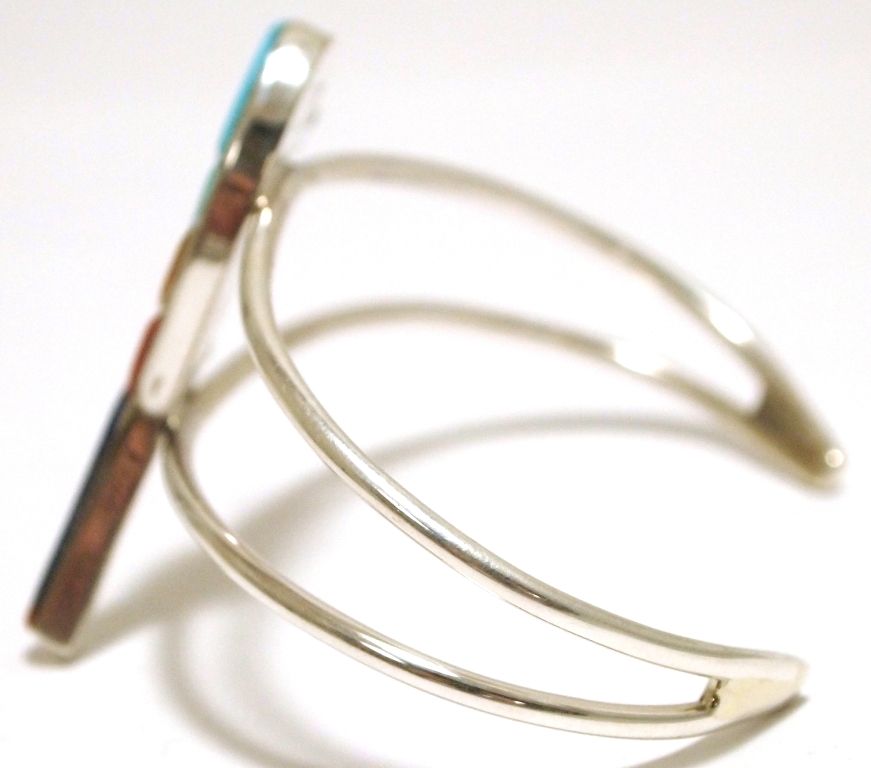 Measures 4-7/8" around with a 1-1/4" gap, 1-5/8" wide. Stones present: Coral, Turquoise, White & Golden Mother of Pearl, Black Jet, Lapis Lazuli.