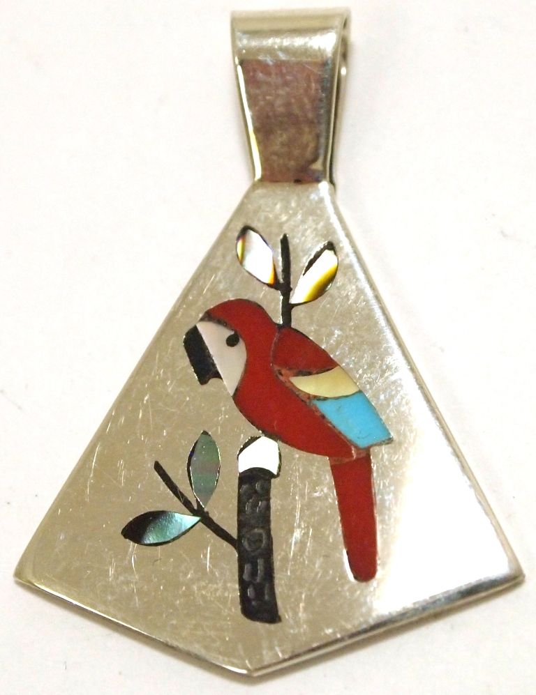 Zuni Multi-Stone Inlay Macaw Sterling Silver Pendant - Sanford Edaakie