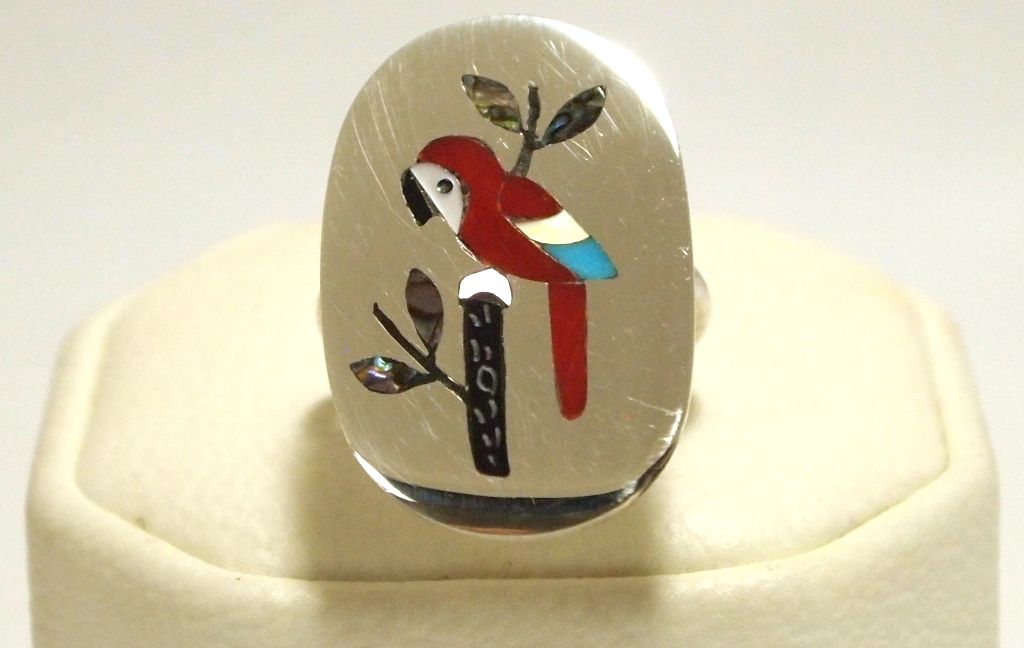 Zuni Multi-Stone Inlay Macaw Sterling Silver Women's Ring - Sanford C Edaakie