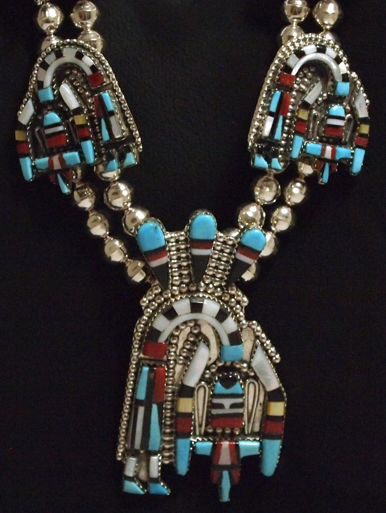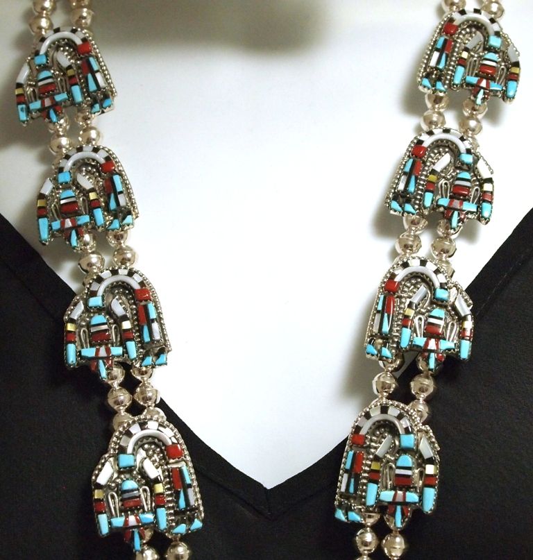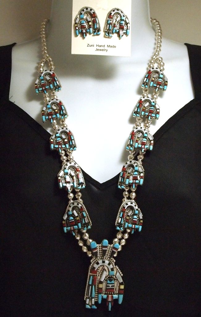 Zuni Multi-Stone Inlay Rainbow Kachina Sterling Silver Necklace & Earrings Set - Herbert Cellicion