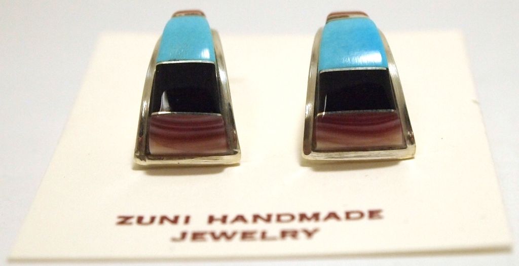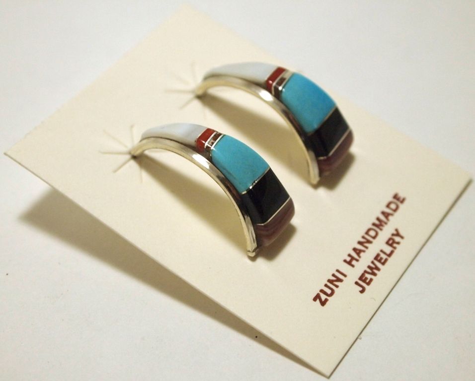 Zuni Multi-Stone Inlay Sterling Silver Curved Post Earrings - C.S. Lonjose