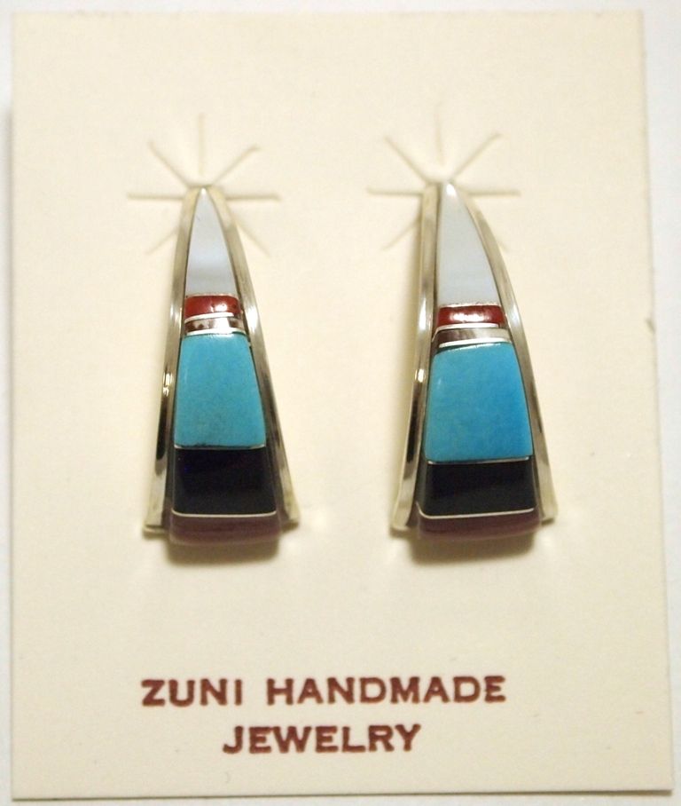 Zuni Multi-Stone Inlay Sterling Silver Curved Post Earrings - C.S. Lonjose