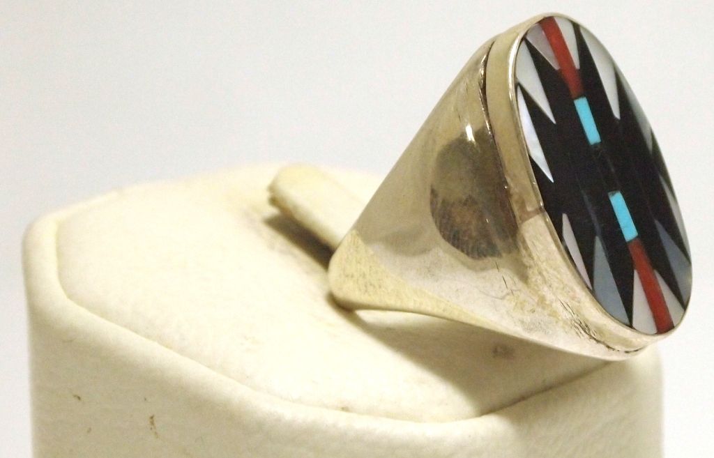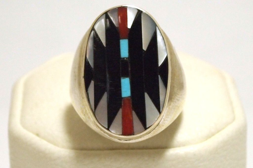 Inlay measures 1" tall by 5/8" wide. Band measures 1/8" wide, size: 10.75. Stones present: Mother of Pearl, Coral, Turquoise, Onyx.