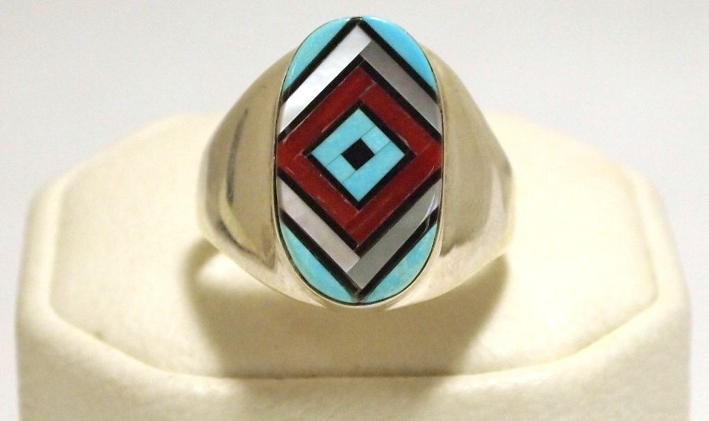 Zuni Multi-Stone Inlay Sterling Silver Men's Ring - V Vacit