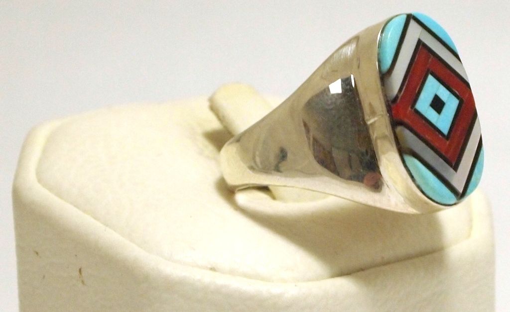 Inlay measures 3/4" tall by 7/16" wide. Band measures 3/16" wide, size: 12. Stones present: Coral, Turquoise, Mother of Pearl, Black Jet.