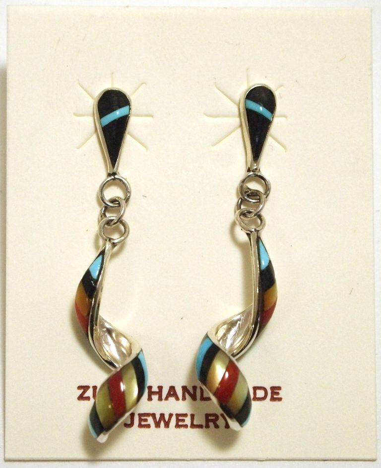 Zuni Multi-Stone Inlay Sterling Silver Spiraling Post Earrings - Idella Edaakie
