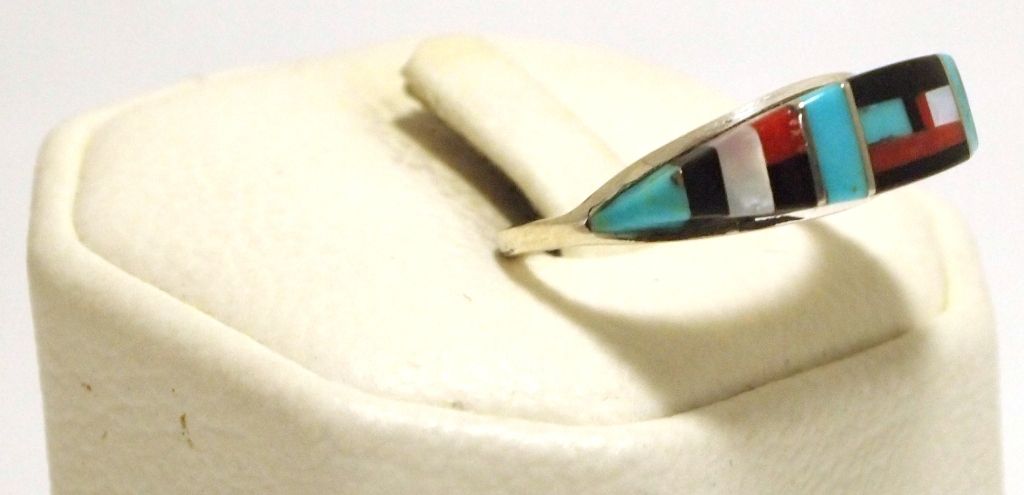 Inlay measures 1/4" tall by 3/4" wide. Band measures 1/16" wide, size: 7.25. Stones present: Mother of Pearl, Black Jet, Coral, Turquoise.