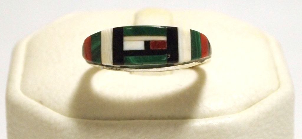 Inlay measures 1/4" tall by 3/4" wide. Band measures 1/16" wide, size: 7.5. Stones present: Shell, Black Jet, Coral, Malachite.