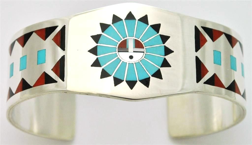 Zuni Multi-Stone Inlay Sun Design Sterling Silver Cuff Bracelet - Fred & Lolita Natachu