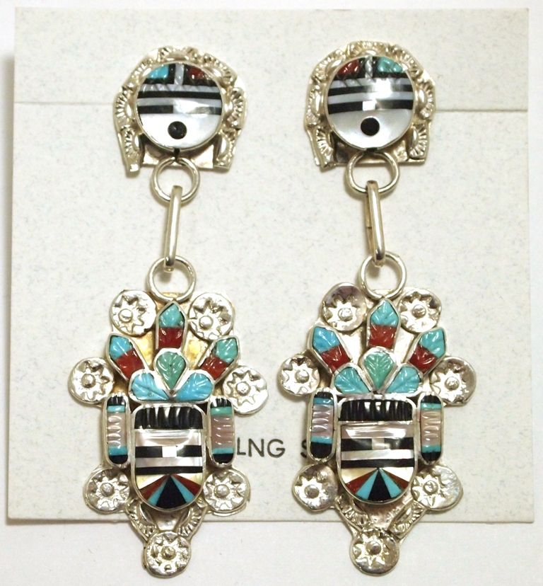Zuni Multi-Stone Inlay Sun Face & Kachina Sterling Silver Post Earrings - Eldred Martinez