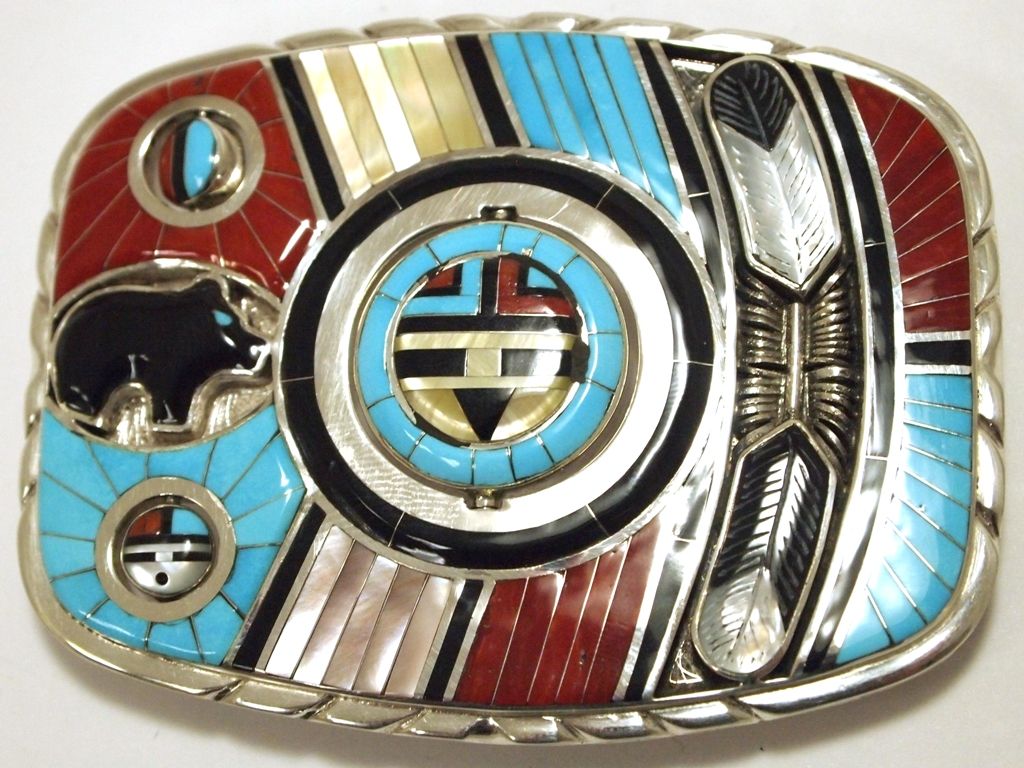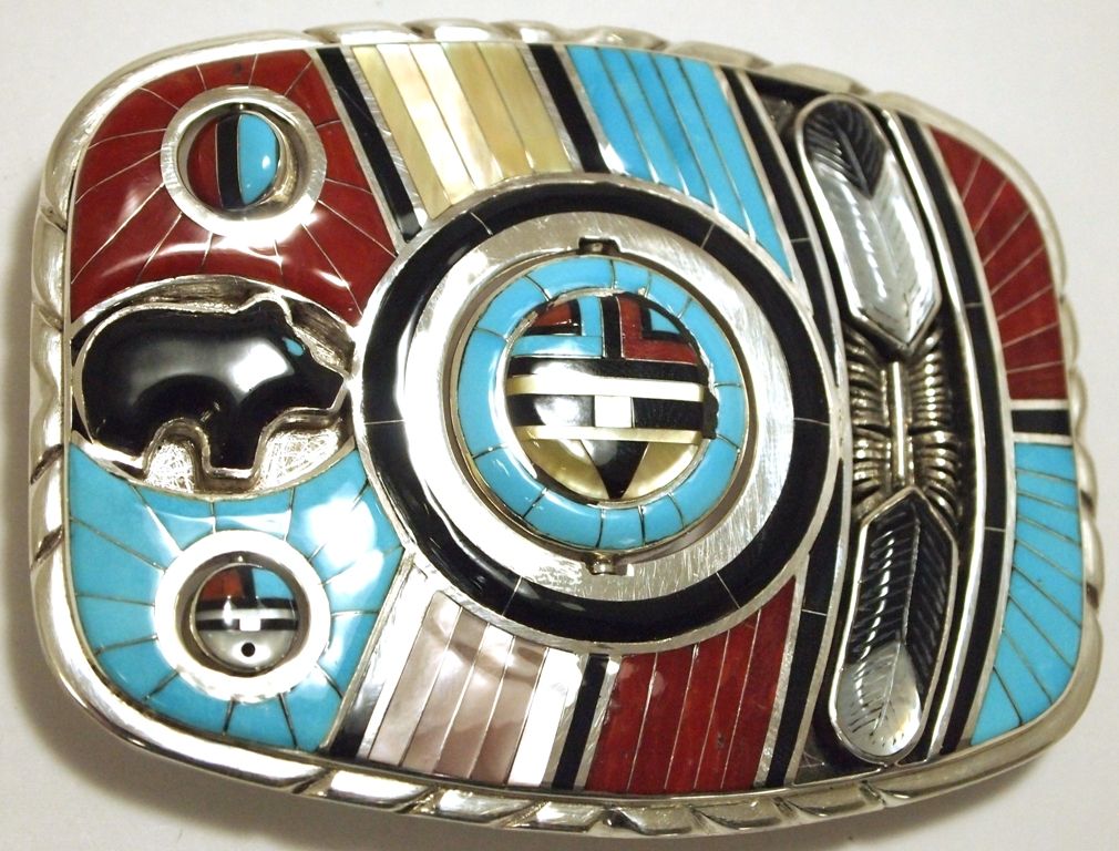 Zuni Multi-Stone Inlay Sun Face Spinner Sterling Silver Buckle - Don Dewa