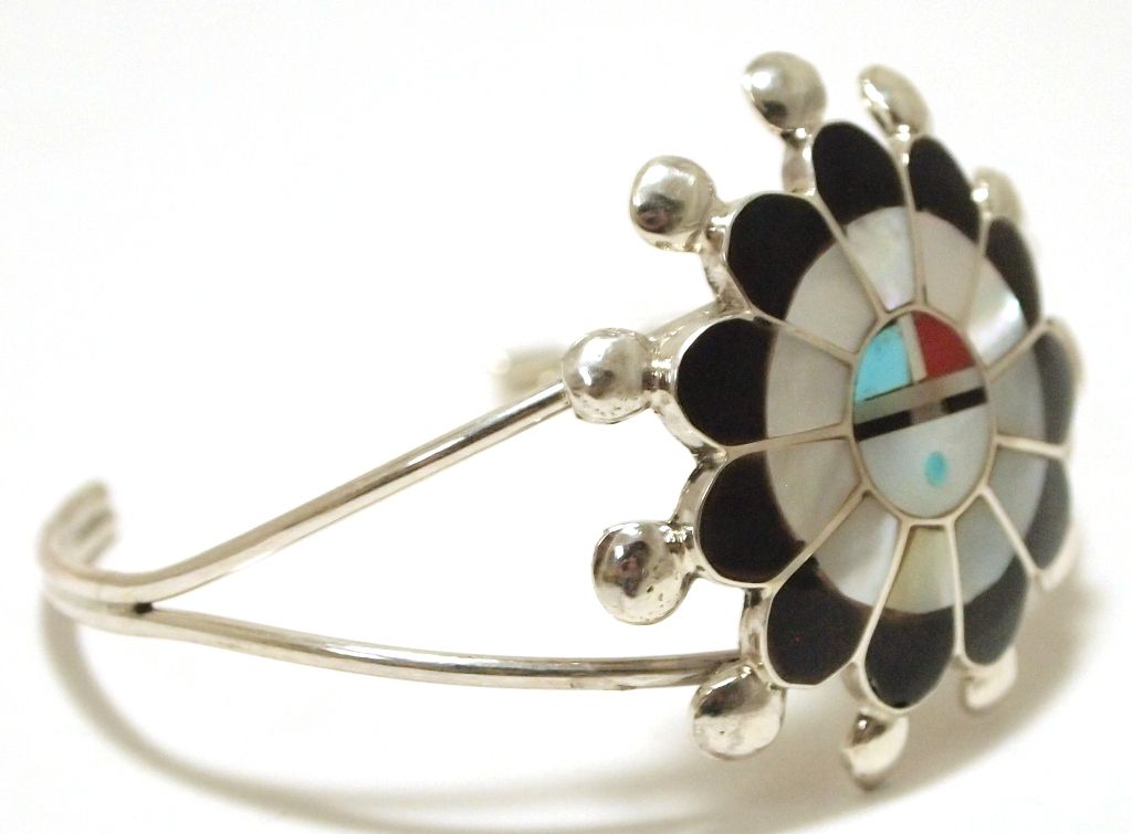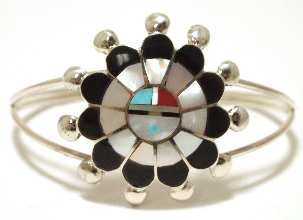 Zuni Multi-Stone Inlay Sun Face Sterling Silver Cuff Bracelet - Pauline Lonjose