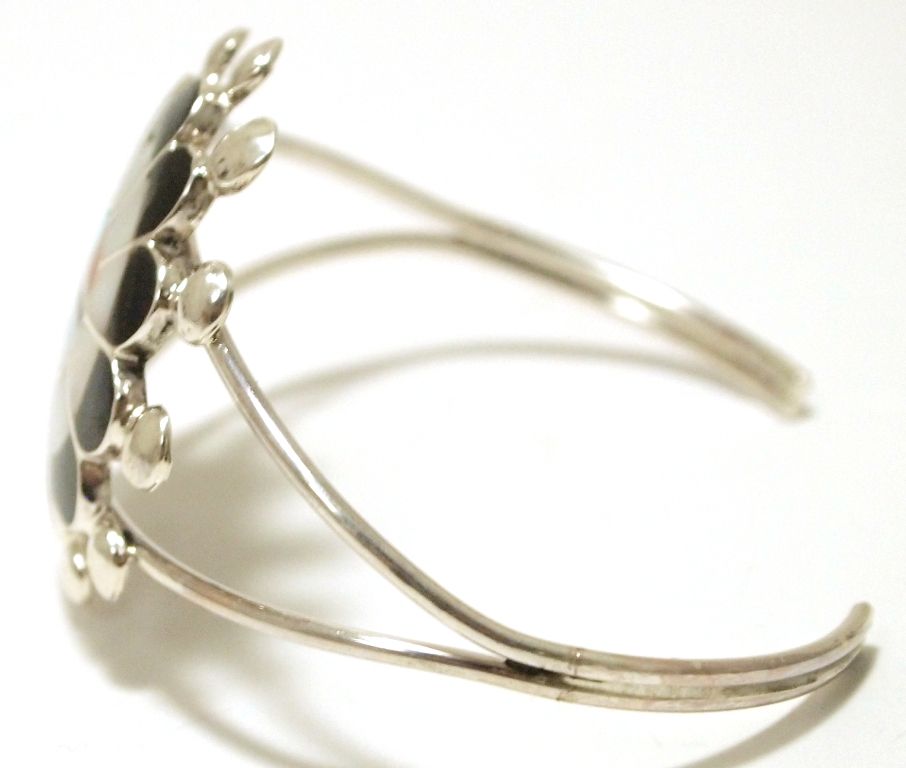 Measures 5-1/4" around with a 1-1/8" gap, 1-1/2" wide. Stones present: Mother of Pearl, Coral, Onyx, Turquoise.