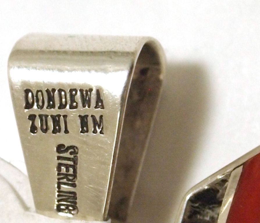 Measures 2-1/2" tall by 1-1/2" wide including bale. Bale opening measures 1/4". Bale rotates horizontally, sun face rotates horizontally, and middle circle rotates vertically. Stones present: White & Golden Mother of Pearl (front & back sun faces), Onyx, Coral, Turquoise.