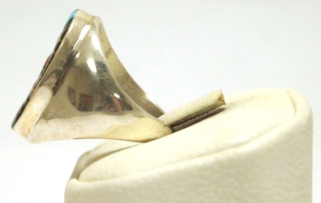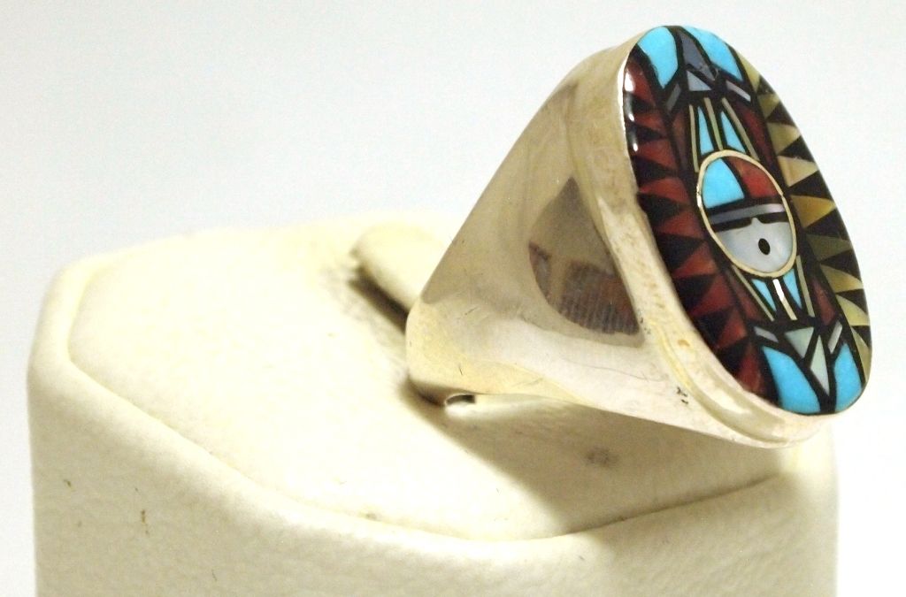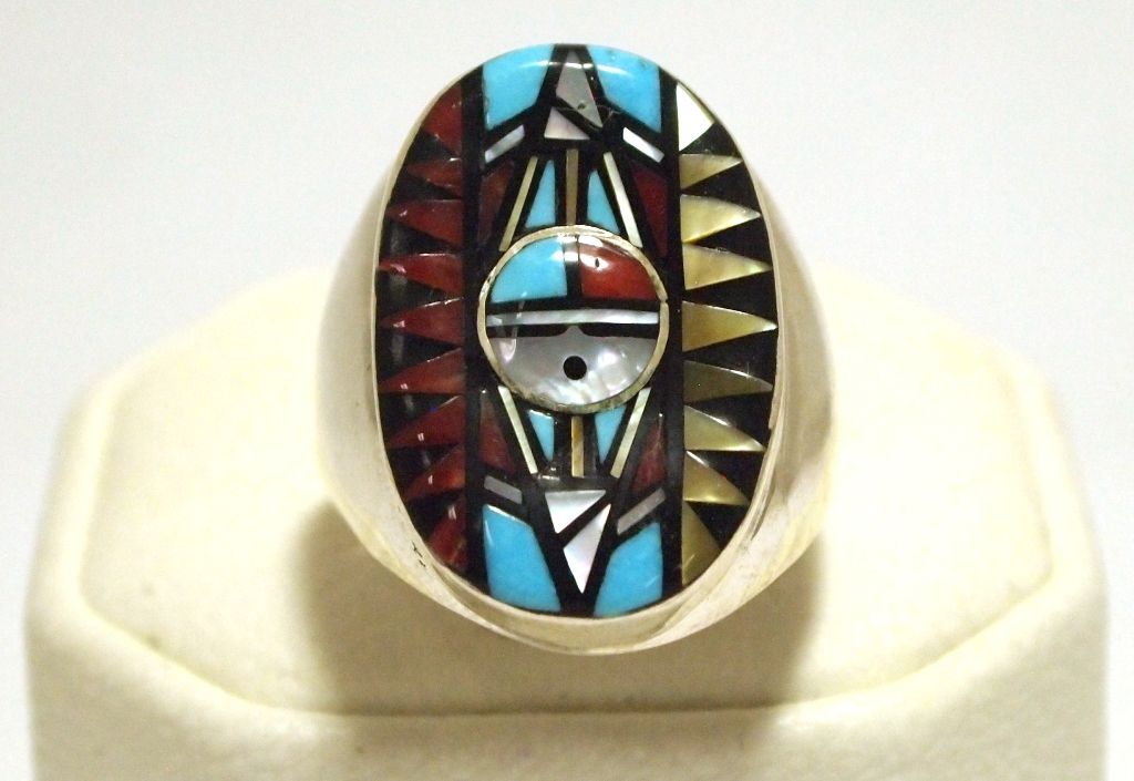 Face measures 1" tall by 5/8" wide. Band measures 1/8" wide, size: 10.5. Stones present: White & Golden Mother of Pearl, Onyx, Coral, Turquoise.