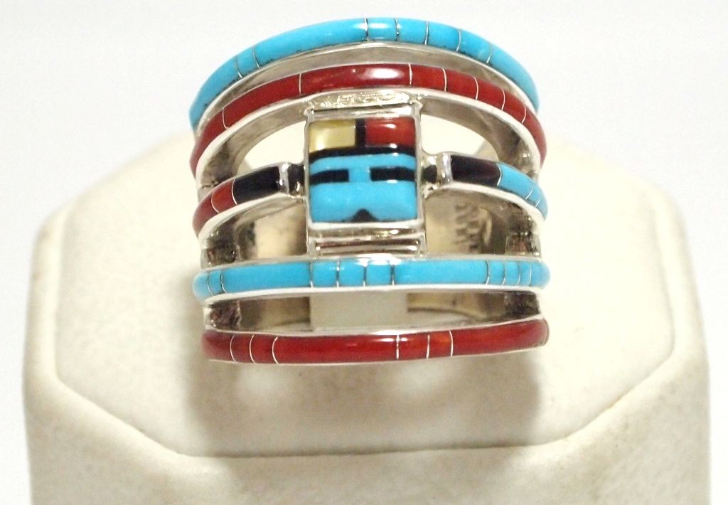 Sun face measures 1/4" in diameter. Ring band measures from 3/8" to 1" wide. Stones present: Coral, Turquoise, Onyx, Golden Lipped Mother of Pearl. Size: 7.75