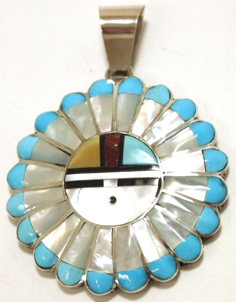 Zuni Multi-Stone Inlay Sun Face Sterling Silver Pendant - Verdel & Esther Niiha