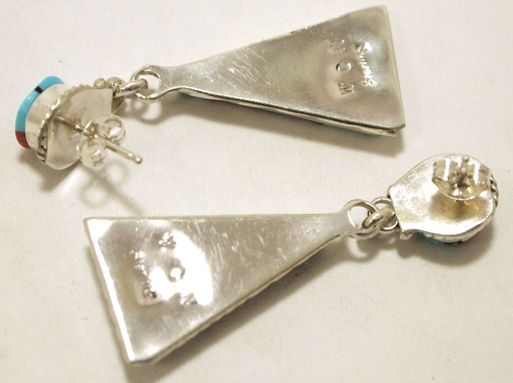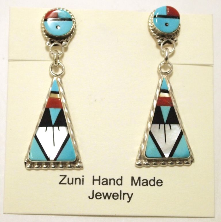 Measure 1-7/8" tall by 5/8" wide. Stones present: Mother of Pearl, Coral, Turquoise, Onyx.