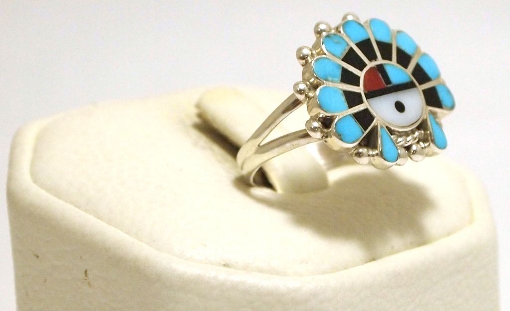 Zuni Multi-Stone Inlay Sun Face Sterling Silver Women's Ring - Emma Romancito
