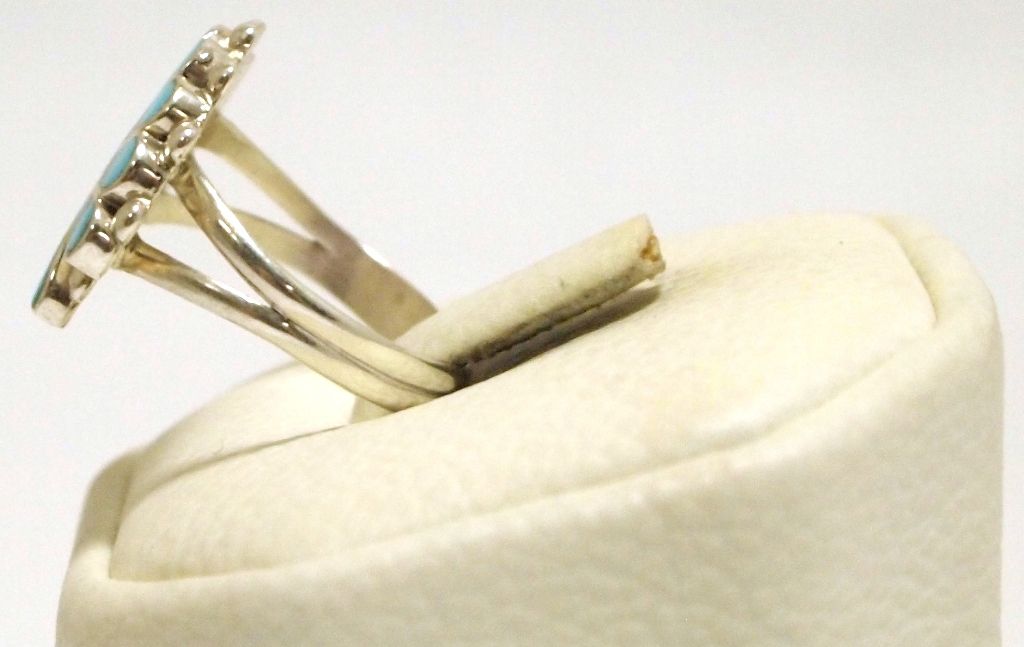 Face measures 5/8" tall by 3/4" wide. Band measures 1/8" wide, size: 6.75. Stones present: Mother of Pearl, Black Jet, Coral, Turquoise.