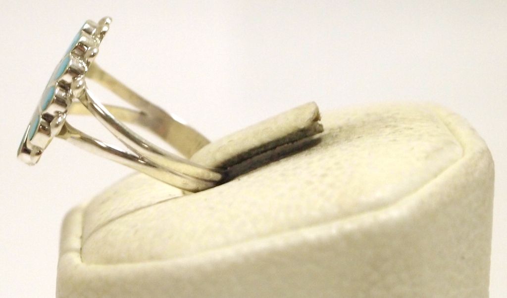 Face measures 5/8" tall by 3/4" wide. Band measures 1/8" wide, size: 7.75. Stones present: Mother of Pearl, Coral, Turquoise, Onyx.
