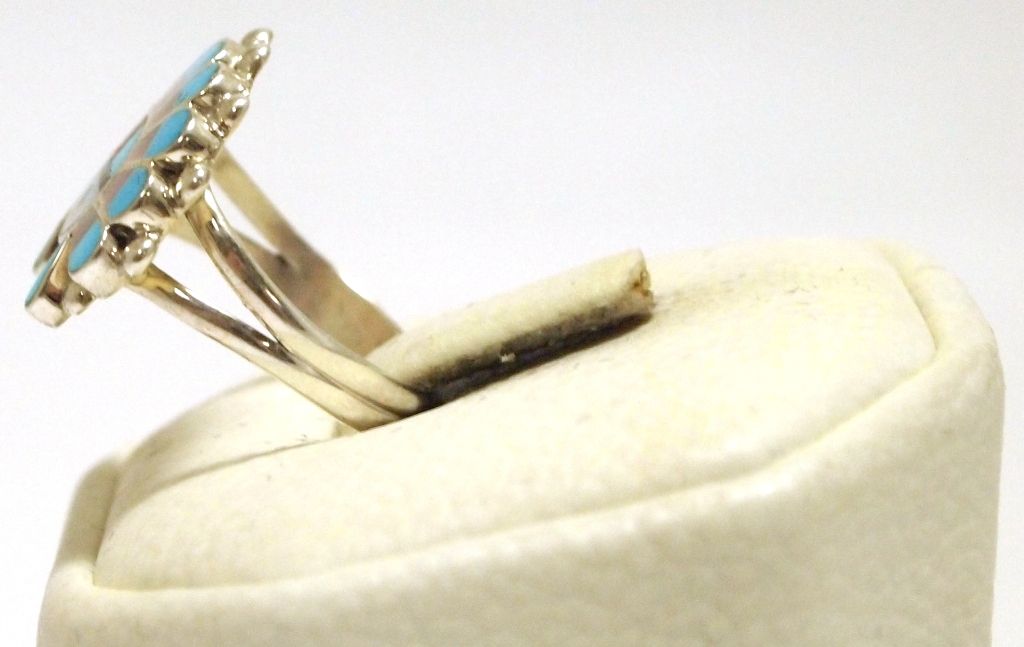 Face measures 5/8" tall by 3/4" wide. Band measures 1/8" wide, size: 5.75. Stones present: Pink & White Mother of Pearl, Coral, Turquoise, Onyx.