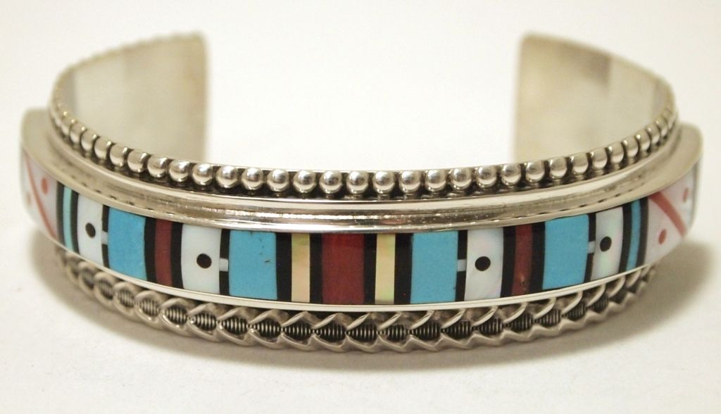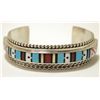 Measures 5-3/4" around with a 1-1/2" gap, 3/4" wide. Stones present: Coral, Turquoise, Mother of Pearl, Onyx.
